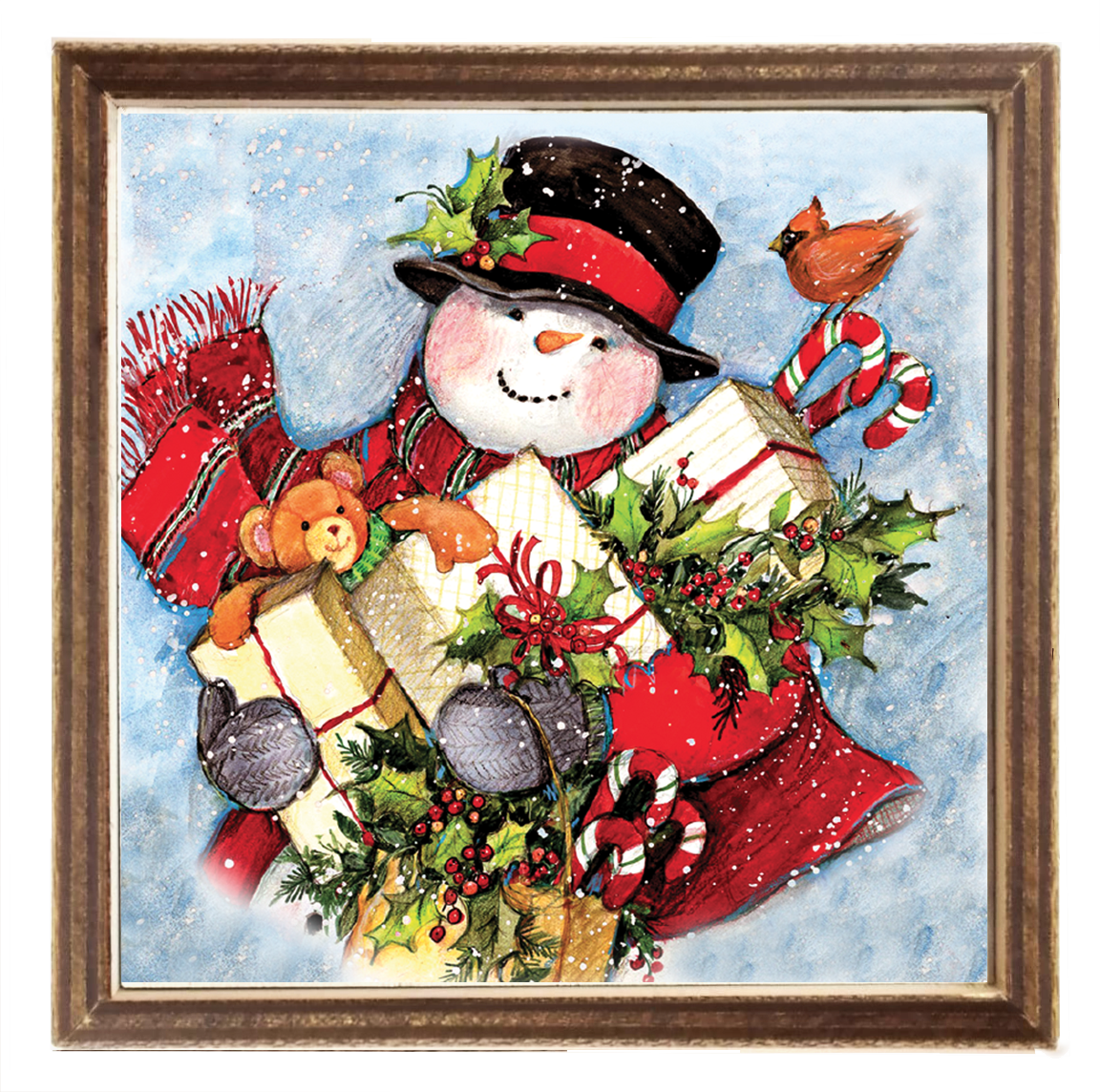 Soggetto: Un pupazzo di neve carico di regali.